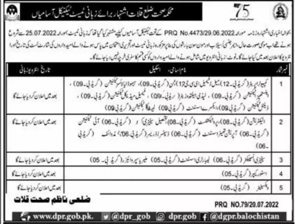 Oral test Health Department Kalat 2022 announce the Contract career opportunities for the post of See Below Ad in Balochistan, Kalat for the fresh and experienced candidates on Contract basis who have Check Advertisement degree. Posted date of this post is 21/07/2022 and the last date is 25/07/2022. if you are eligible for this job apply before due date.