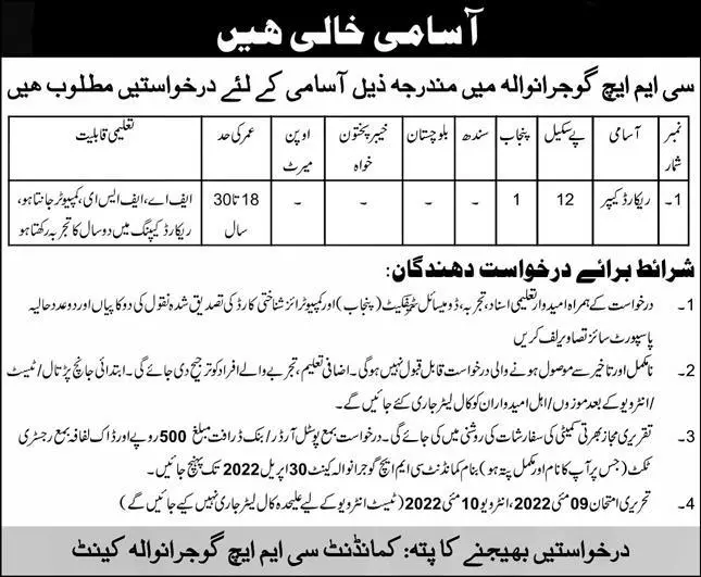 Pak Army Civilian Jobs 2022 at CMH Gujranwala announce the Permanent career opportunities for the post of See Below Ad in Punjab, Gujranwala for the fresh and experienced candidates on Permanent basis who have Check Advertisement degree. Posted date of this post is 17/04/2022 and the last date is 30/04/2022. if you are eligible for this job apply before due date.