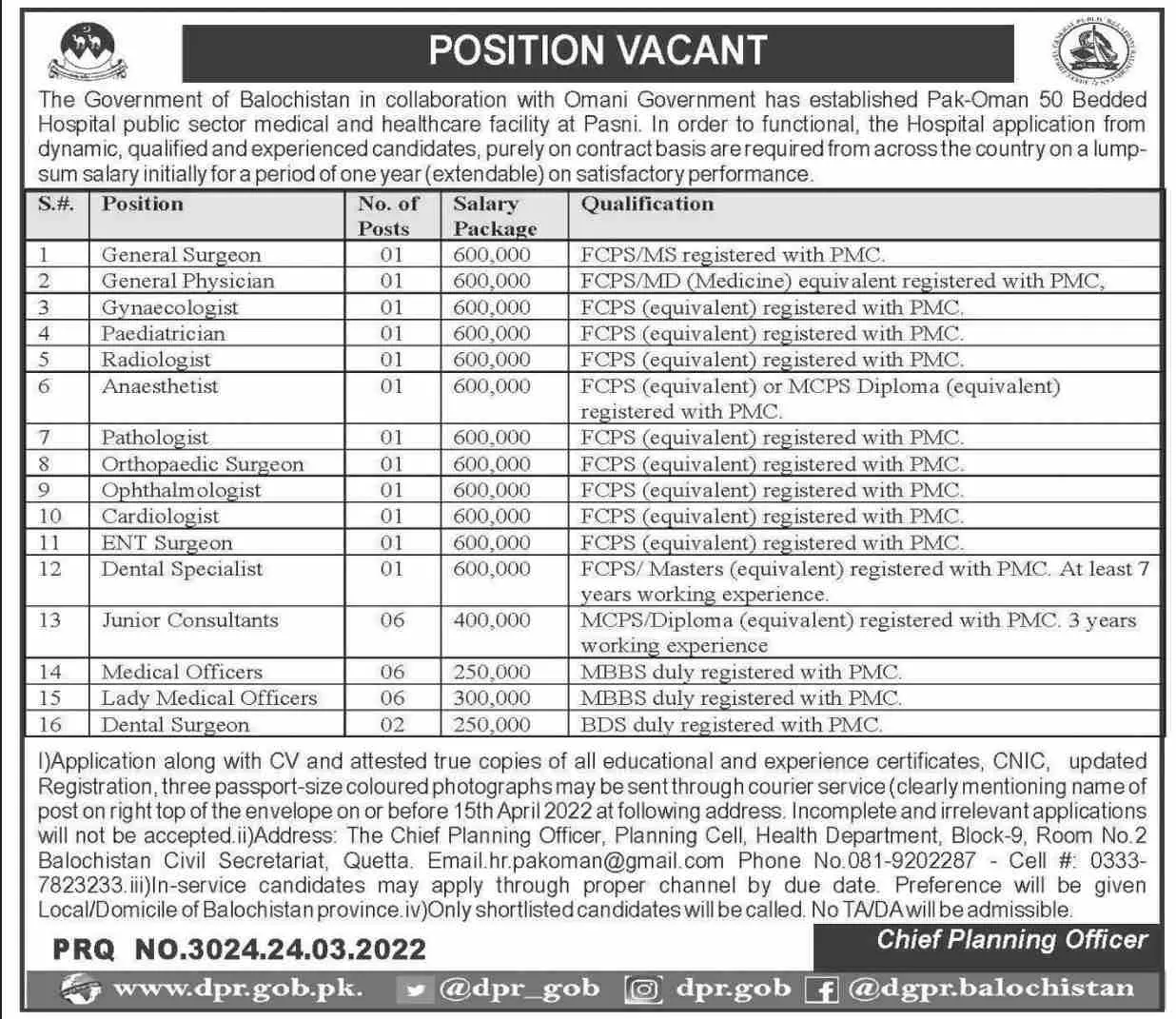 Jobs in Pak-Oman 50 Bedded Hospital Pasni 2022 announce the Contract career opportunities for the post of See Below Ad in Balochistan, Pasni for the fresh and experienced candidates on Contract basis who have Check Advertisement degree. Posted date of this post is 25/03/2022 and the last date is 15/04/2022. if you are eligible for this job apply before due date.