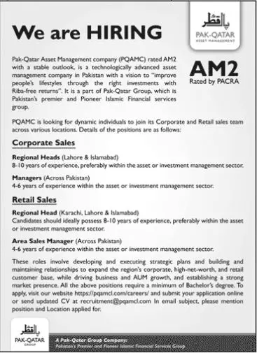 Pak Qatar Group Lahore, lahore, karachi and islamabad Punjab Pakistan invites applications from eligible candidates for the post of regional head corporate sales, regional head retail sales, manager corporate sales and area sales manager as per advertisement of October 15, 2023 published in daily Dawn Newspaper. Candidates with Master and Bachelor etc.