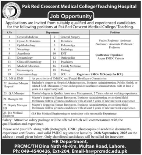 Pak Red Crescent Medical College Faculty Jobs 2025 announce the Contract career opportunities for the post of See Below Ad in Punjab, Lahore for the fresh and experienced candidates on Contract basis who have Check Advertisement degree. Posted date of this post is 21/09/2025 and the last date is 24/09/2025. if you are eligible for this job apply before due date.
