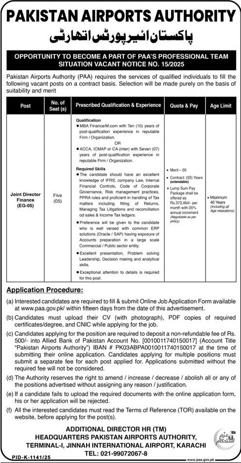 Pakistan Airports Authority PAA Karachi Jobs 2025 announce the Contract career opportunities for the post of See Below Ad in Sindh, Karachi for the fresh and experienced candidates on Contract basis who have Check Advertisement degree. Posted date of this post is 05/10/2025 and the last date is 20/10/2025. if you are eligible for this job apply before due date.
