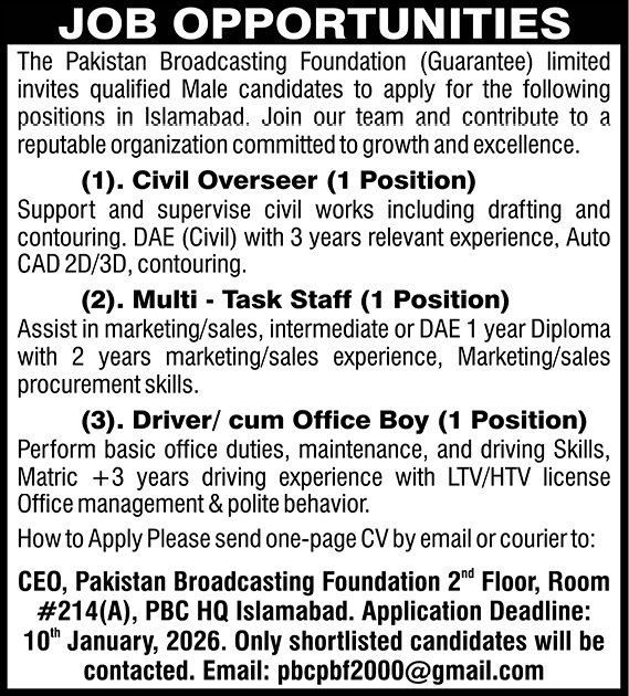 CEO, Pakistan Broadcasting Foundation 2nd Floor, Room #214(A), PBC HQ Islamabad. Application Deadline: 10th January, 2026. Only shortlisted candidates will be contacted. Email: pbcpbf2000@gmail.com.