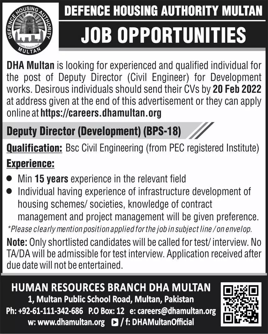 Pakistan Defence Housing Authority Multan Jobs announce the Contract career opportunities for the post of See Below Ad in Multan for the fresh and experienced candidates on Contract basis who have degree. Posted date of this post is 13/02/2022 and the last date is 20/02/2022. if you are eligible for this job apply before due date.