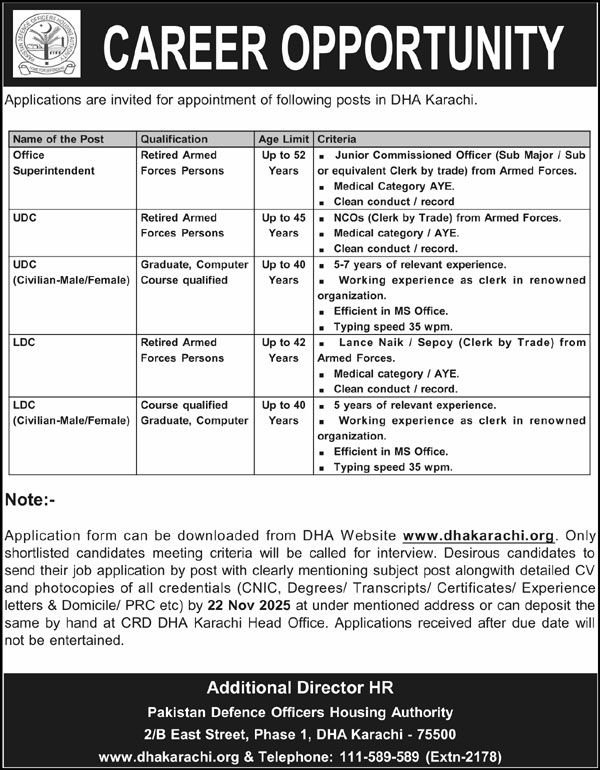 Pakistan Defence Officers Housing Authority Karachi Jobs announce the Contract career opportunities for the post of See Below Ad in Sindh, Karachi for the fresh and experienced candidates on Contract basis who have Check Advertisement degree. Posted date of this post is 14/11/2025 and the last date is 22/11/2025. if you are eligible for this job apply before due date.