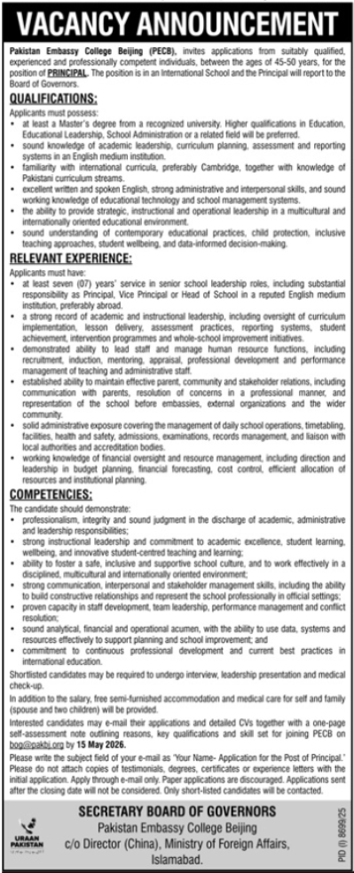 Pakistan Embassy College Beijing (PECB) invites applications from suitably qualified, experienced, and professionally competent individuals, between the ages of 45-50 years, for the position of PRINCIPAL. The position is in an International School, and the Principal will report to the Board of Governors.