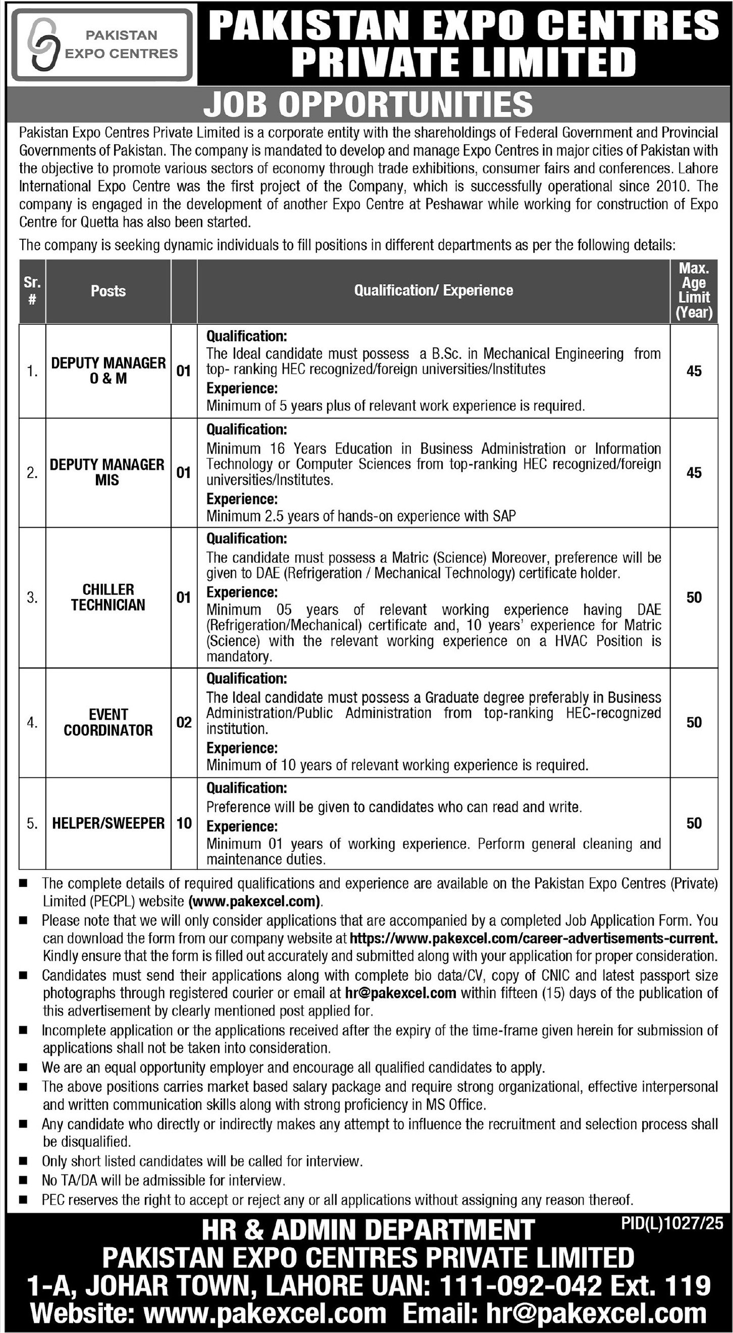 Pakistan Expo Centres Pvt Ltd Lahore Jobs 2025 announce the Contract career opportunities for the post of See Below Ad in Punjab, Lahore for the fresh and experienced candidates on Contract basis who have Check Advertisement degree. Posted date of this post is 19/10/2025 and the last date is 03/11/2025. if you are eligible for this job apply before due date.