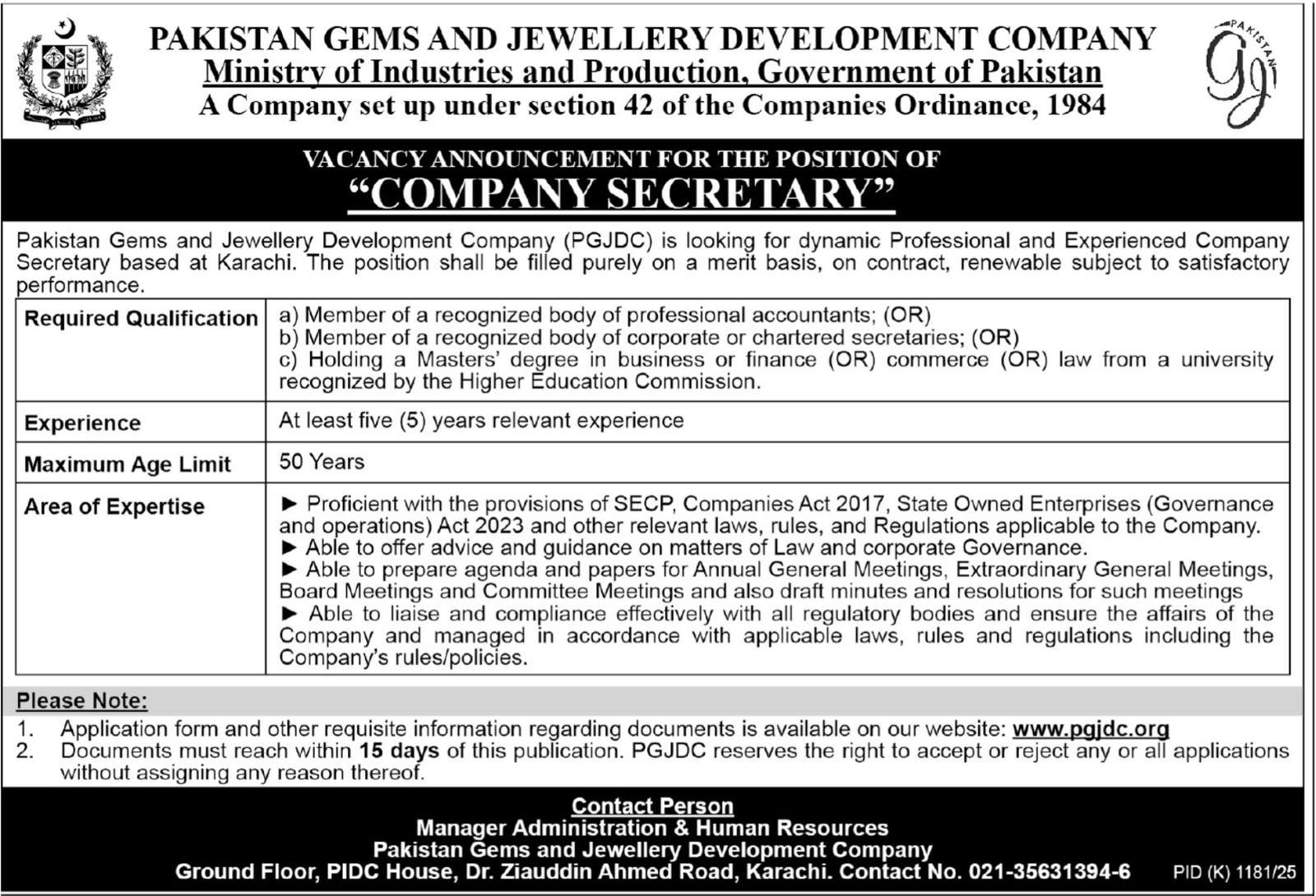Pakistan Gems And Jewelry Development Company Jobs 2025 announce the Contract career opportunities for the post of See Below Ad in Sindh, Karachi for the fresh and experienced candidates on Contract basis who have Check Advertisement degree. Posted date of this post is 05/10/2025 and the last date is 20/10/2025. if you are eligible for this job apply before due date.