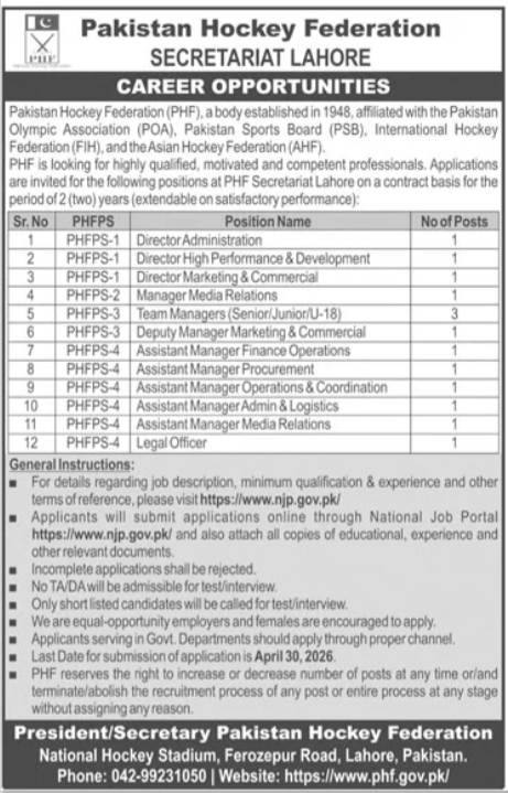Pakistan Hockey Federation PHF Lahore Jobs 2026 announce the Contract career opportunities for the post of See Below Ad in Punjab, Lahore for the fresh and experienced candidates on Contract basis who have Check Advertisement degree. Posted date of this post is 16/04/2026 and the last date is 30/04/2026. if you are eligible for this job apply before due date.