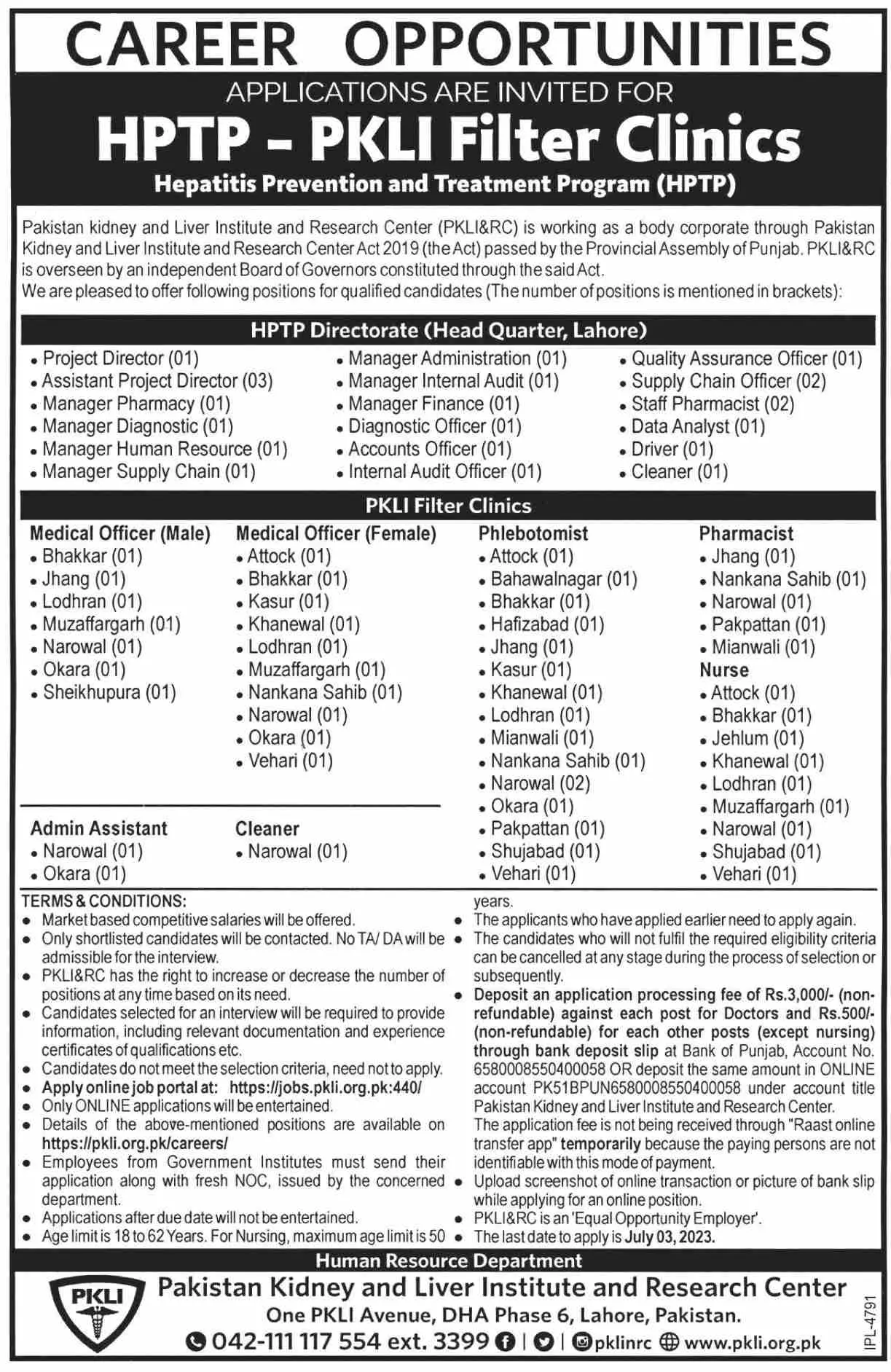 Pakistan Kidney And Liver Institute PKLI Jobs 2023 announce the Contract career opportunities for the post of See Below Ad in Punjab, Lahore for the fresh and experienced candidates on Contract basis who have Check Advertisement degree. Posted date of this post is 16/06/2023 and the last date is 03/07/2023. if you are eligible for this job apply before due date.