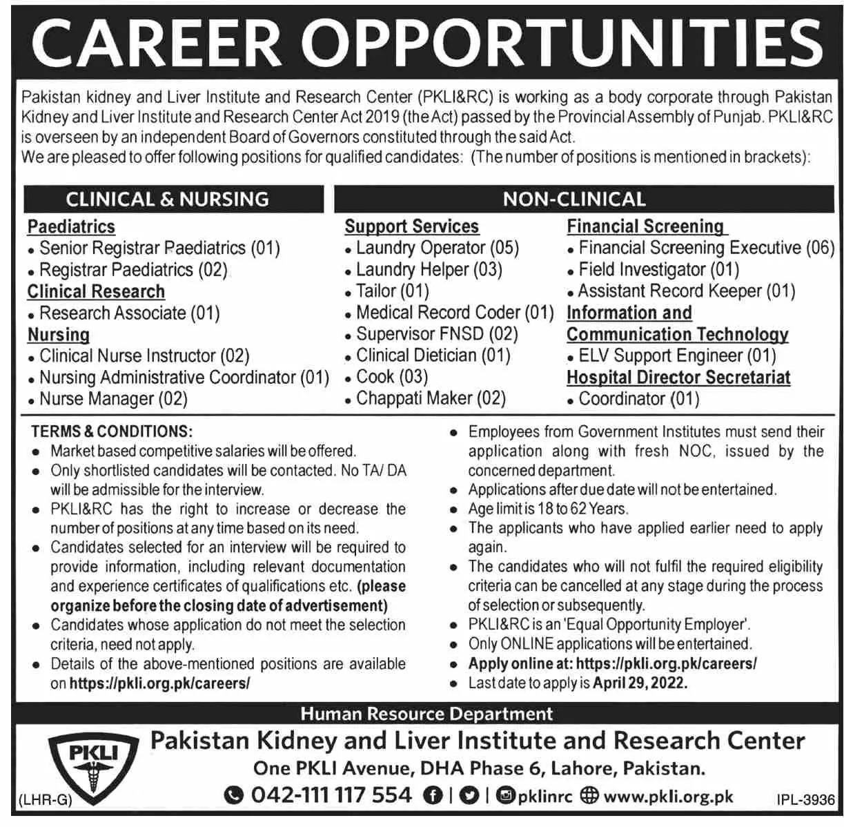 Pakistan Kidney And Liver Institute & Research Center Jobs announce the Contract career opportunities for the post of See Below Ad in Punjab, Lahore for the fresh and experienced candidates on Contract basis who have Check Advertisement degree. Posted date of this post is 14/04/2022 and the last date is 29/04/2022. if you are eligible for this job apply before due date.