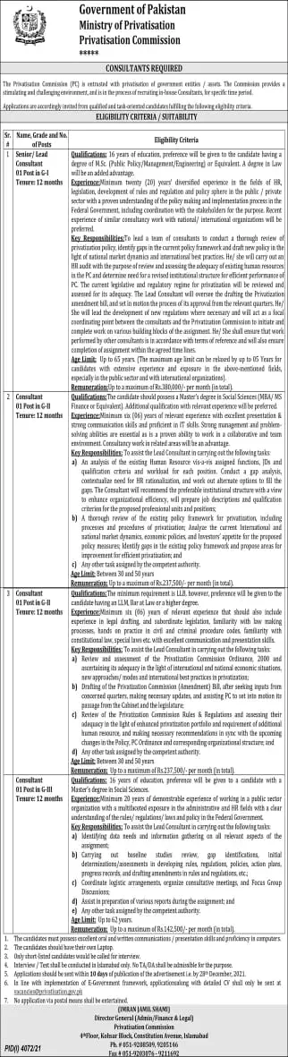 Pakistan ministry of privatization commission Jobs announce the Permanent career opportunities for the post of check the advertisement in Federal for the fresh and experienced candidates on Permanent basis who have Check Advertisement degree. Posted date of this post is 18/12/2021 and the last date is 28/12/2021. if you are eligible for this job apply before due date.