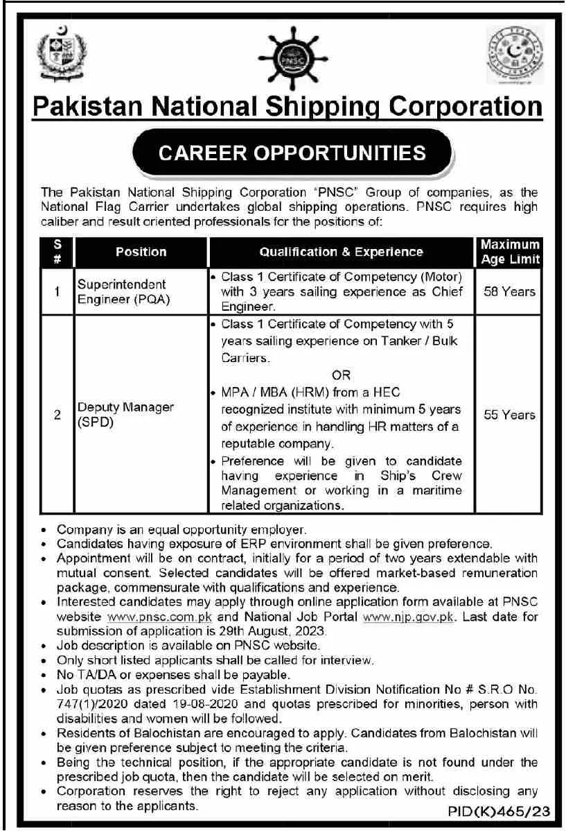 Pakistan National Shipping Corporation Karachi Jobs 2023 announce the Contract career opportunities for the post of See Below Ad in Sindh, Karachi for the fresh and experienced candidates on Contract basis who have Check Advertisement degree. Posted date of this post is 13/08/2023 and the last date is 29/08/2023. if you are eligible for this job apply before due date.