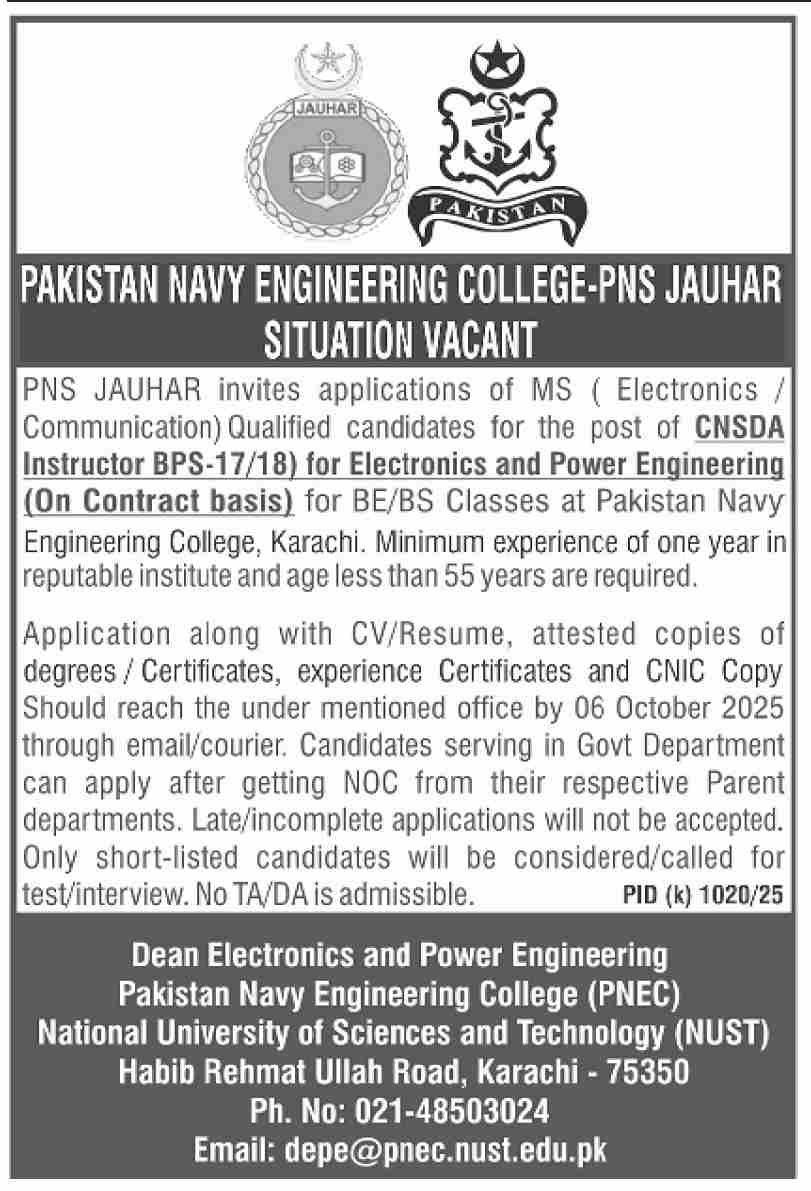 PNS JAUHAR invites applications of MS (Electronics / Communication) Qualified candidates for the post of CNSDA Instructor (BPS-17/18) for Electronics and Power Engineering (On Contract basis) for BE/BS Classes at Pakistan Navy Engineering College, Karachi. Minimum experience of one year in reputable institute and age less than 55 years are required.