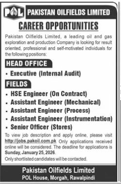Pakistan Oilfields Limited POL Rawalpindi Jobs 2026 announce the Contract career opportunities for the post of See Below Ad in Punjab, Rawalpindi for the fresh and experienced candidates on Contract basis who have Check Advertisement degree. Posted date of this post is 18/01/2026 and the last date is 25/01/2026. if you are eligible for this job apply before due date.