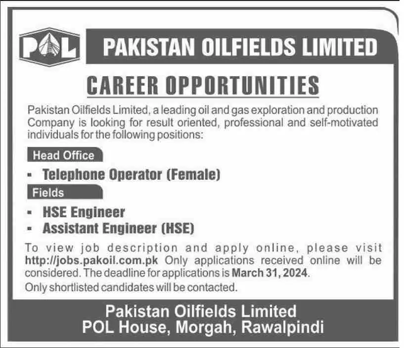 Pakistan oilfields Limited Rawalpindi Jobs 2024 announce the Contract career opportunities for the post of See Below Ad in Punjab, Rawalpindi for the fresh and experienced candidates on Contract basis who have Check Advertisement degree. Posted date of this post is 24/03/2024 and the last date is 31/03/2024. if you are eligible for this job apply before due date.