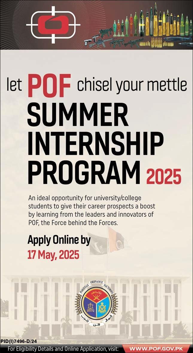 Pakistan Ordnance Factories POF Internship Program 2025 announce the Contract career opportunities for the post of See Below Ad in Punjab for the fresh and experienced candidates on Contract basis who have Check Advertisement degree. Posted date of this post is 03/05/2025 and the last date is 17/05/2025. if you are eligible for this job apply before due date.