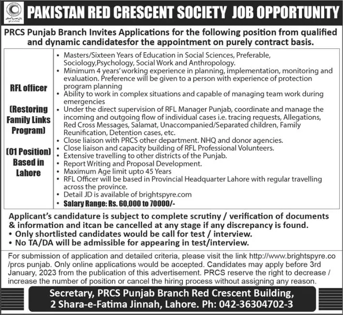 - Pakistan Red Crescent Society PRCS Lahore, lahore Punjab Pakistan invites applications from eligible candidates for the post of rfl officer and restoring family links program as per advertisement of December 24, 2022 published in daily Nawaiwaqt Newspaper. Candidates with Master etc.