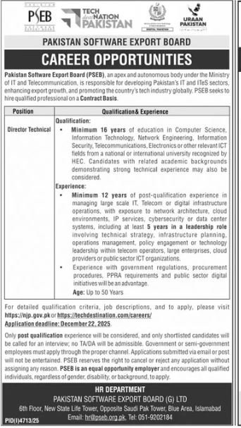 Pakistan Software Export Board PSEB Islamabad Jobs 2025 announce the Contract career opportunities for the post of See Below Ad in Federal, Islamabad for the fresh and experienced candidates on Contract basis who have Check Advertisement degree. Posted date of this post is 07/12/2025 and the last date is 22/12/2025. if you are eligible for this job apply before due date.