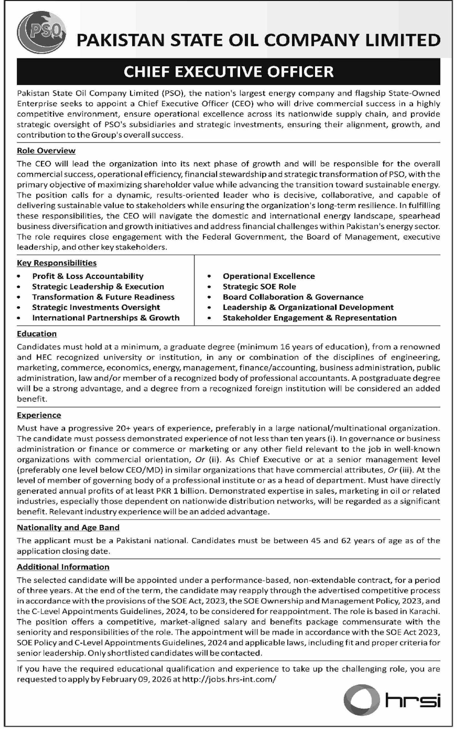 Pakistan State Oil Karachi Jobs 2026 announce the Contract career opportunities for the post of See Below Ad in Sindh, Karachi for the fresh and experienced candidates on Contract basis who have Check Advertisement degree. Posted date of this post is 25/01/2026 and the last date is 09/02/2026. if you are eligible for this job apply before due date.