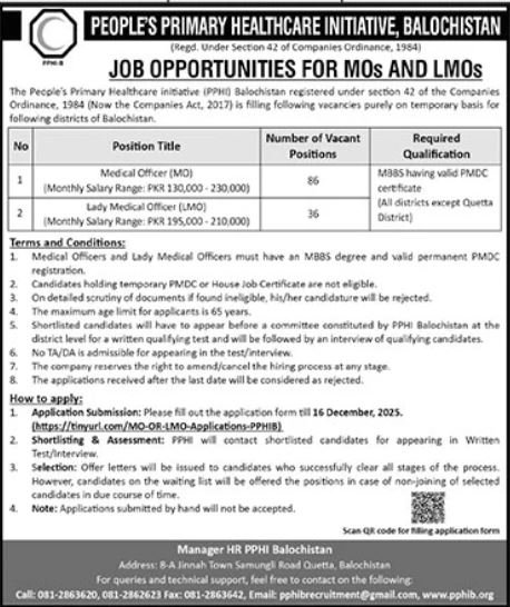 Peoples Primary Healthcare Initiative Quetta Jobs 2025 announce the Contract career opportunities for the post of See Below Ad in Balochistan, Quetta for the fresh and experienced candidates on Contract basis who have Check Advertisement degree. Posted date of this post is 29/11/2025 and the last date is 16/12/2025. if you are eligible for this job apply before due date.