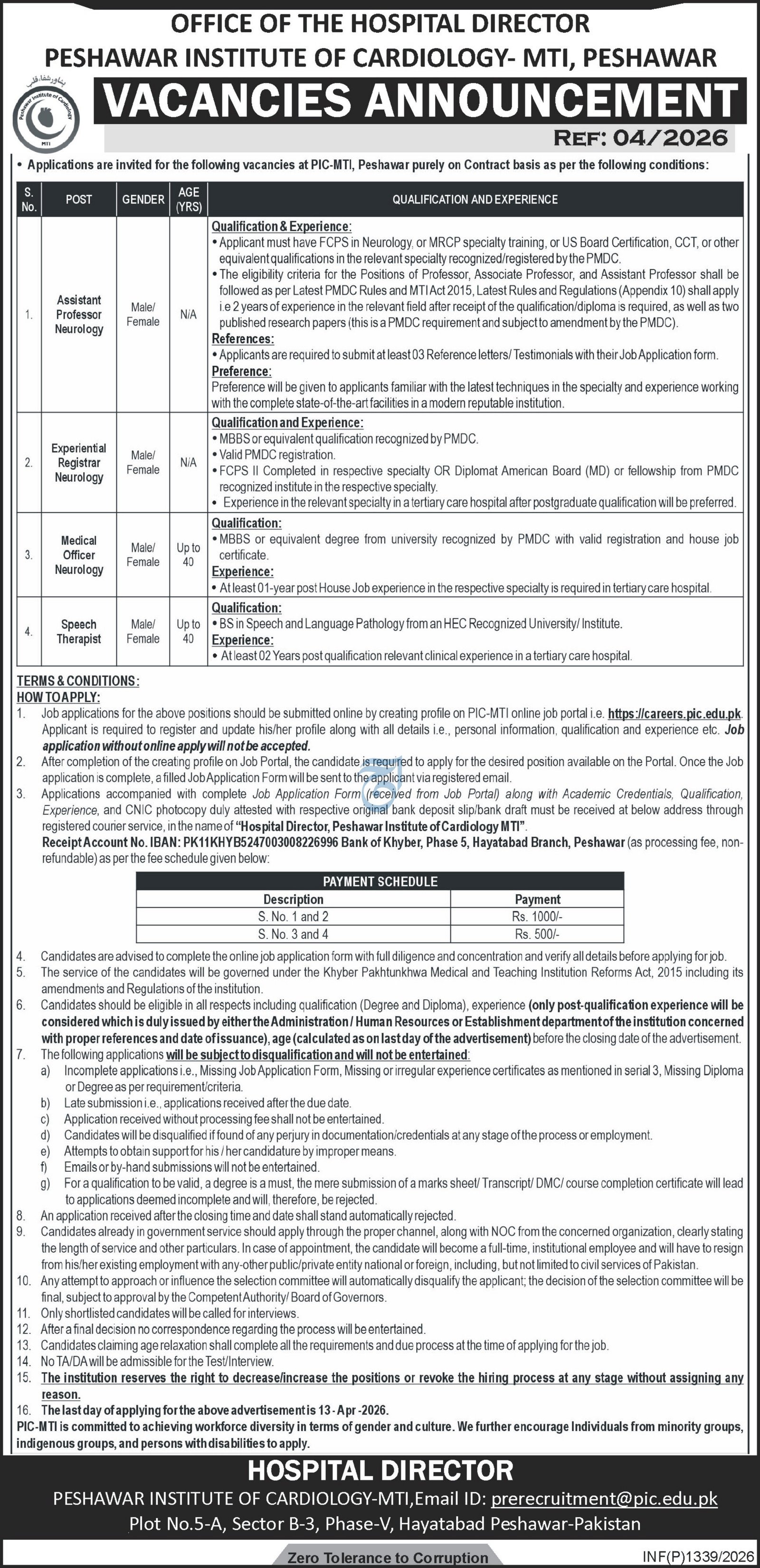 Peshawar Institute of Cardiology Jobs 2026 announce the Contract career opportunities for the post of See Below Ad in Khyber Pakhtunkhwa, Peshawar for the fresh and experienced candidates on Contract basis who have Check Advertisement degree. Posted date of this post is 30/03/2026 and the last date is 31/03/2026. if you are eligible for this job apply before due date.