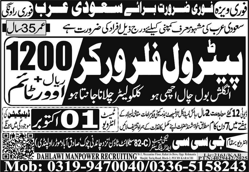 Petrol Filler Worker Jobs Open In Saudi Arabia 2025 announce the Contract career opportunities for the post of See Below Ad in Saudi Arabia for the fresh and experienced candidates on Contract basis who have Check Advertisement degree. Posted date of this post is 27/09/2025 and the last date is 01/10/2025. if you are eligible for this job apply before due date.