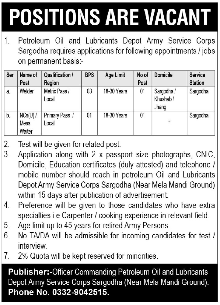 Petroleum Oil & Lubricants Depot Army Service Corps Jobs announce the Contract career opportunities for the post of See Below Ad in Punjab, Sargodha for the fresh and experienced candidates on Contract basis who have Check Advertisement degree. Posted date of this post is 06/12/2025 and the last date is 20/12/2025. if you are eligible for this job apply before due date.