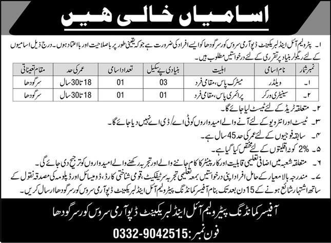 Petroleum Oil & Lubricants POL Depot ASC Sargodha Jobs 2025 announce the Contract career opportunities for the post of See Below Ad in Punjab, Sargodha for the fresh and experienced candidates on Contract basis who have Check Advertisement degree. Posted date of this post is 05/11/2025 and the last date is 19/11/2025. if you are eligible for this job apply before due date.