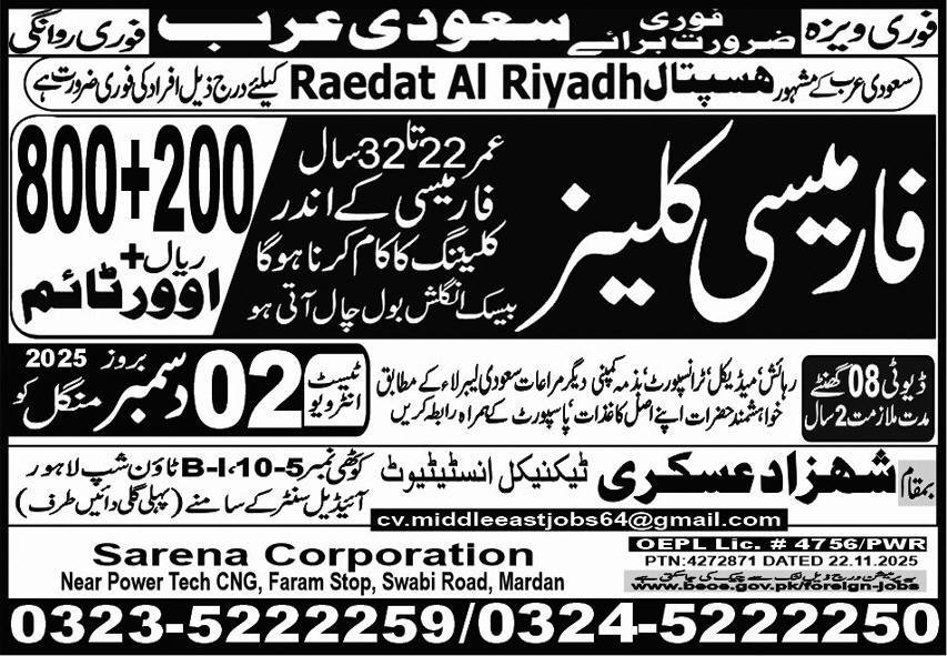 Pharmacy Cleaner & Cleaner Jobs 2025 In Saudi Arabia announce the Contract career opportunities for the post of See Below Ad in Saudi Arabia for the fresh and experienced candidates on Contract basis who have Check Advertisement degree. Posted date of this post is 29/11/2025 and the last date is 02/12/2025. if you are eligible for this job apply before due date.
