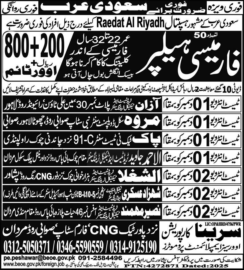 Pharmacy Helper Jobs 2025 In Saudi Arabia announce the Contract career opportunities for the post of See Below Ad in Saudi Arabia for the fresh and experienced candidates on Contract basis who have Check Advertisement degree. Posted date of this post is 29/11/2025 and the last date is 02/12/2025. if you are eligible for this job apply before due date.