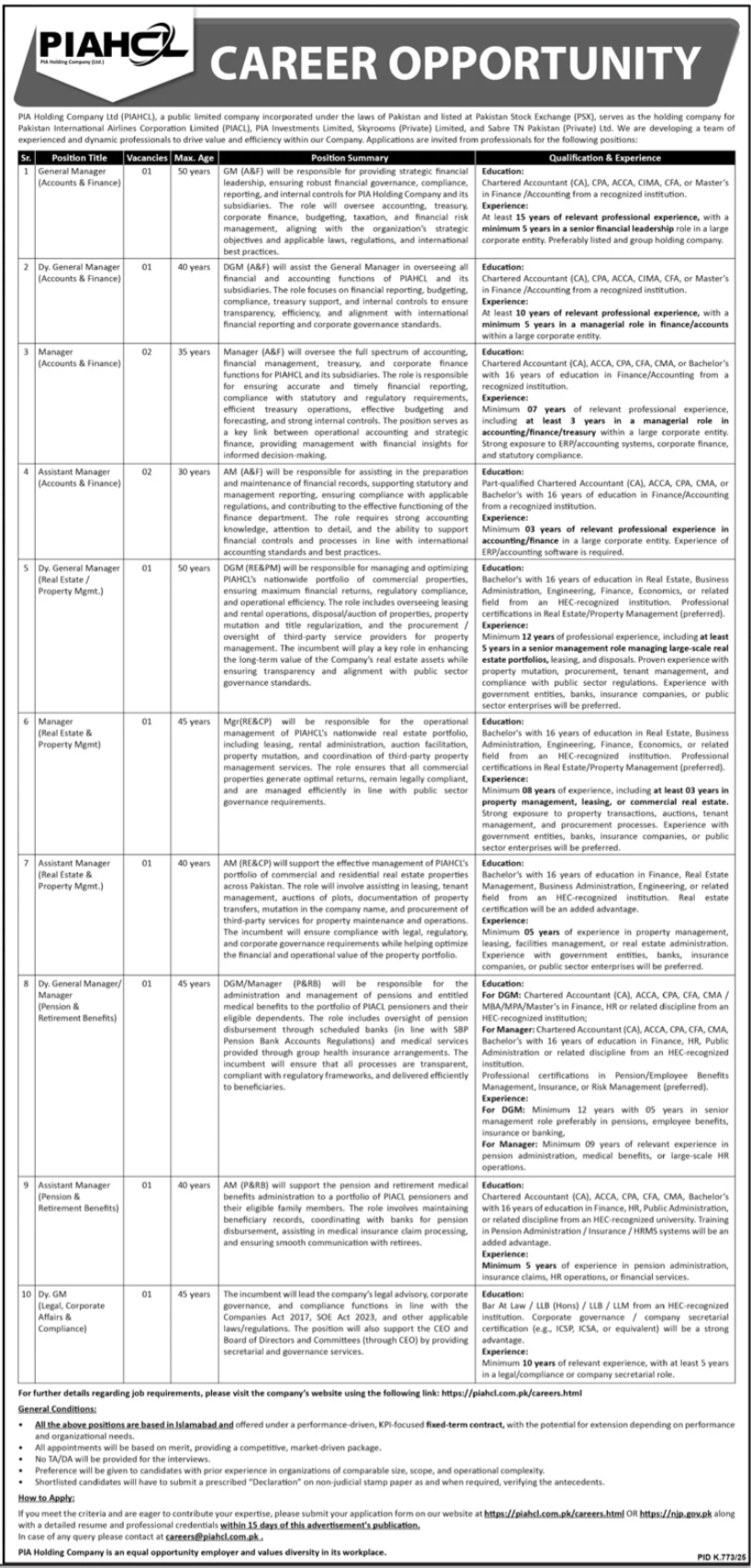 PIA Holding Company Limited PIAHCL Jobs 2025 announce the Contract career opportunities for the post of See Below Ad in Sindh, Karachi for the fresh and experienced candidates on Contract basis who have Check Advertisement degree. Posted date of this post is 31/08/2025 and the last date is 15/09/2025. if you are eligible for this job apply before due date.