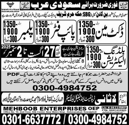 Pipe Fitter & Building Electrician Jobs 2025 In Saudi Arabia announce the Contract career opportunities for the post of See Below Ad in Saudi Arabia for the fresh and experienced candidates on Contract basis who have Check Advertisement degree. Posted date of this post is 21/08/2025 and the last date is 02/09/2025. if you are eligible for this job apply before due date.