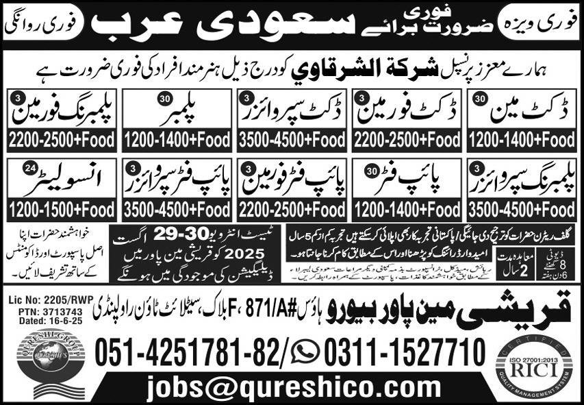 Pipe Fitter Supervisor & Plumbing Supervisor Jobs 2025 announce the Contract career opportunities for the post of See Below Ad in Saudi Arabia for the fresh and experienced candidates on Contract basis who have Check Advertisement degree. Posted date of this post is 27/08/2025 and the last date is 30/08/2025. if you are eligible for this job apply before due date.