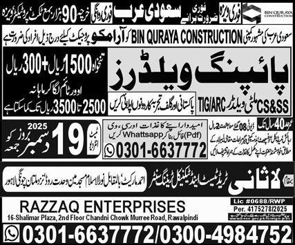 Pipe Welders Jobs in Saudia Arabia 2025 announce the Contract career opportunities for the post of See Below Ad in Saudi Arabia for the fresh and experienced candidates on Contract basis who have Check Advertisement degree. Posted date of this post is 13/12/2025 and the last date is 19/12/2025. if you are eligible for this job apply before due date.