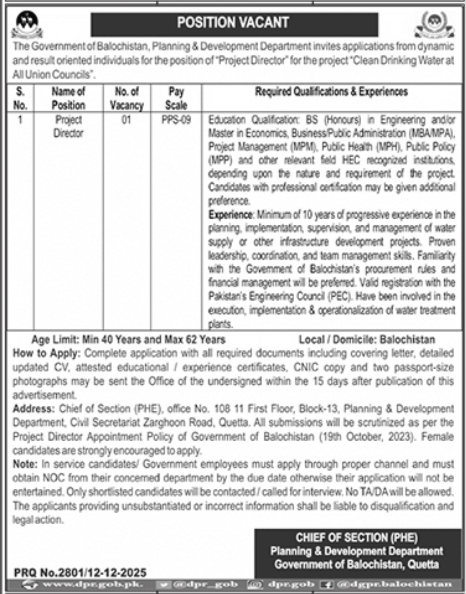 Address: Chief of Section (PHE), office No. 108 11 First Floor, Block-13, Planning & Development Department, Civil Secretariat Zarghoon Road, Quetta. All submissions will be scrutinized as per the Project Director Appointment Policy of Government of Balochistan (19th October, 2023). Female candidates are strongly encouraged to apply.