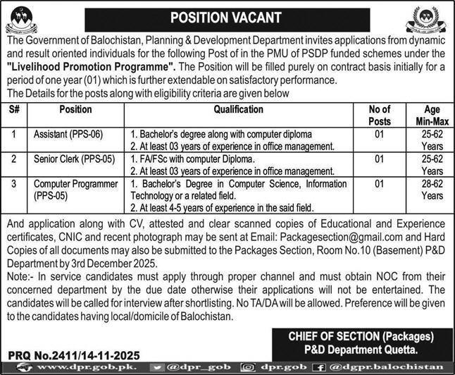 And application along with CV, attested and clear scanned copies of Educational and Experience certificates, CNIC and recent photograph may be sent at Email: Packagesection@gmail.com and Hard Copies of all documents may also be submitted to the Packages Section, Room No.10 (Basement) P&D Department by 3rd December 2025.