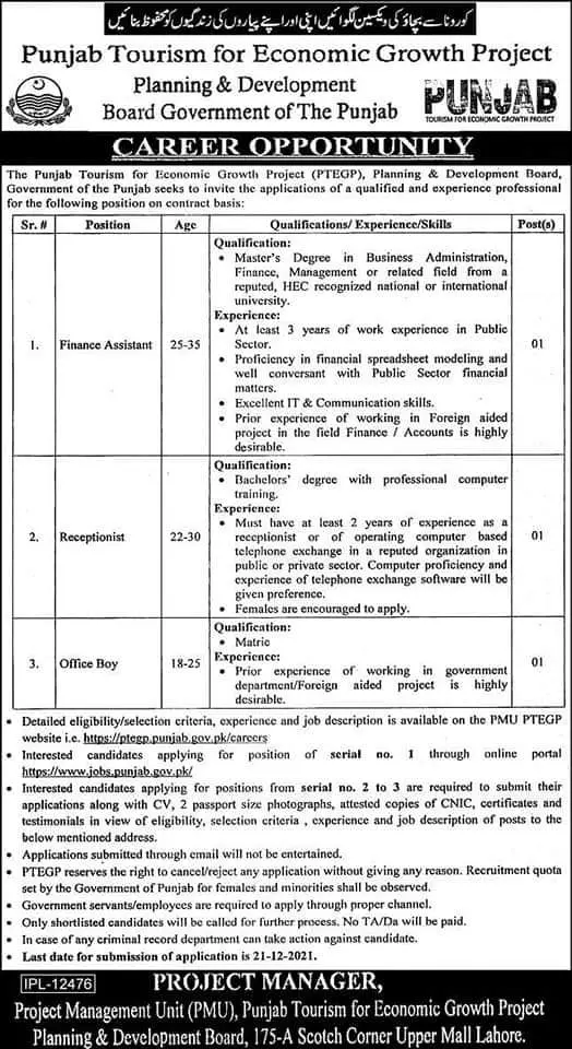 Planning & Development Board Punjab Jobs announce the Contract career opportunities for the post of See Below Ad in Punjab,Lahore for the fresh and experienced candidates on Contract basis who have Check Advertisement degree. Posted date of this post is 05/12/2021 and the last date is 21/12/2021. if you are eligible for this job apply before due date.