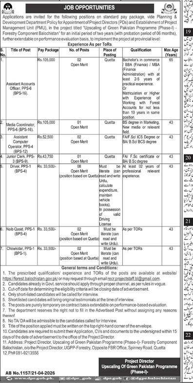 Applications are invited for the following positions on standard pay package, vide Planning & Development Department Policy for Appointment of Project Directors (PDs) and Establishment of Project Management Unit (PMU), in the project titled "Upscaling of Green Pakistan Programme (Phase-I) - Forestry Component Balochistan" for an initial period of two years (with probation period of 06 months), further extendable on performance evaluation basis, to implement the project at provincial level: