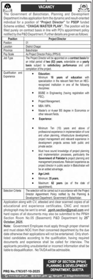 The Government of Balochistan, Planning and Development Department invites application form the dynamic and result-oriented individual for a position of “Project Director for PSDP funded Scheme entitled, “CHAGAI MASTER PLAN”. The position will be filled purely on contract basis in line with PD's appointment policy notified by the P&D Department. Further details are given as follows: