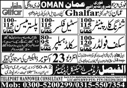 Plaster Mason And Steel Fixer Jobs in Oman 2025 announce the Contract career opportunities for the post of See Below Ad in Oman for the fresh and experienced candidates on Contract basis who have Check Advertisement degree. Posted date of this post is 20/10/2025 and the last date is 23/10/2025. if you are eligible for this job apply before due date.