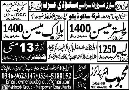 Plaster Mason & Block Mason Jobs In Saudi Arabia 2023 announce the Contract career opportunities for the post of See Below Ad in Saudi Arabia for the fresh and experienced candidates on Contract basis who have Check Advertisement degree. Posted date of this post is 08/05/2023 and the last date is 13/05/2023. if you are eligible for this job apply before due date.