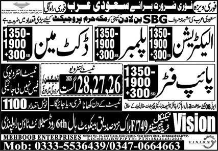 Plumbers And Ducket Man Jobs in Saudia Arabia 2025 announce the Contract career opportunities for the post of See Below Ad in Saudi Arabia for the fresh and experienced candidates on Contract basis who have Check Advertisement degree. Posted date of this post is 18/08/2025 and the last date is 28/08/2025. if you are eligible for this job apply before due date.