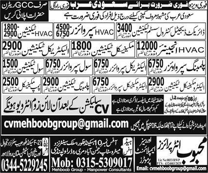 Plumbing supervisor And Civil Supervisor Jobs in Ksa 2025 announce the Contract career opportunities for the post of See Below Ad in Saudi Arabia for the fresh and experienced candidates on Contract basis who have Check Advertisement degree. Posted date of this post is 09/12/2025 and the last date is 25/12/2025. if you are eligible for this job apply before due date.