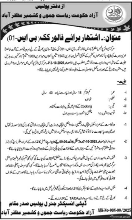 Police Department Muzafffarabad Job 2025 announce the Contract career opportunities for the post of See Below Ad in Azad Jammu Kashmir, Muzaffarabad for the fresh and experienced candidates on Contract basis who have Check Advertisement degree. Posted date of this post is 25/09/2025 and the last date is 07/10/2025. if you are eligible for this job apply before due date.