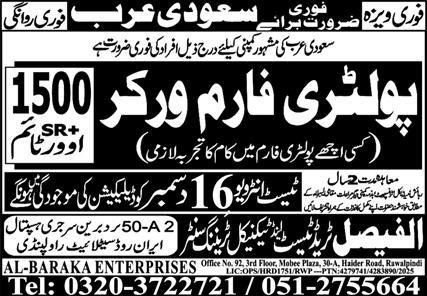 Poltry Form Worker Jobs in Saudia Arabia 2025 announce the Contract career opportunities for the post of See Below Ad in Saudi Arabia for the fresh and experienced candidates on Contract basis who have Check Advertisement degree. Posted date of this post is 14/12/2025 and the last date is 16/12/2025. if you are eligible for this job apply before due date.