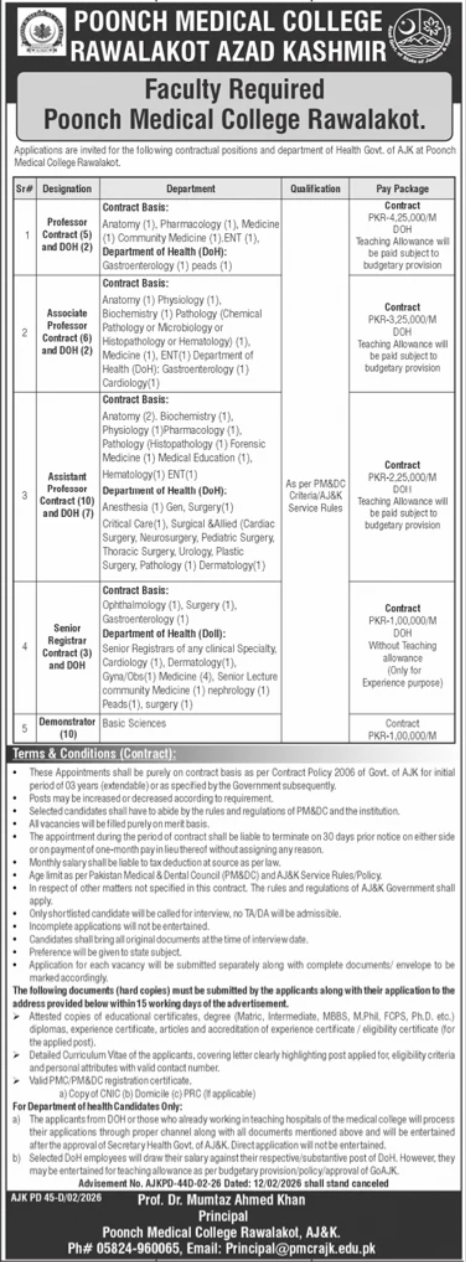 Poonch Medical College Rawalakot Jobs 2026 announce the Contract career opportunities for the post of See Below Ad in Azad Jammu Kashmir, Rawla Kot for the fresh and experienced candidates on Contract basis who have Check Advertisement degree. Posted date of this post is 17/02/2026 and the last date is 04/03/2026. if you are eligible for this job apply before due date.