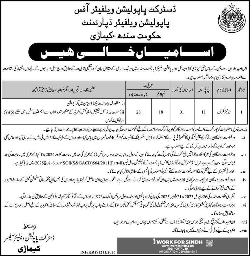 Population Welfare Department Keamari Sindh Jobs 2026 announce the Contract career opportunities for the post of See Below Ad in Sindh, Karachi for the fresh and experienced candidates on Contract basis who have Check Advertisement degree. Posted date of this post is 25/03/2026 and the last date is 09/04/2026. if you are eligible for this job apply before due date.