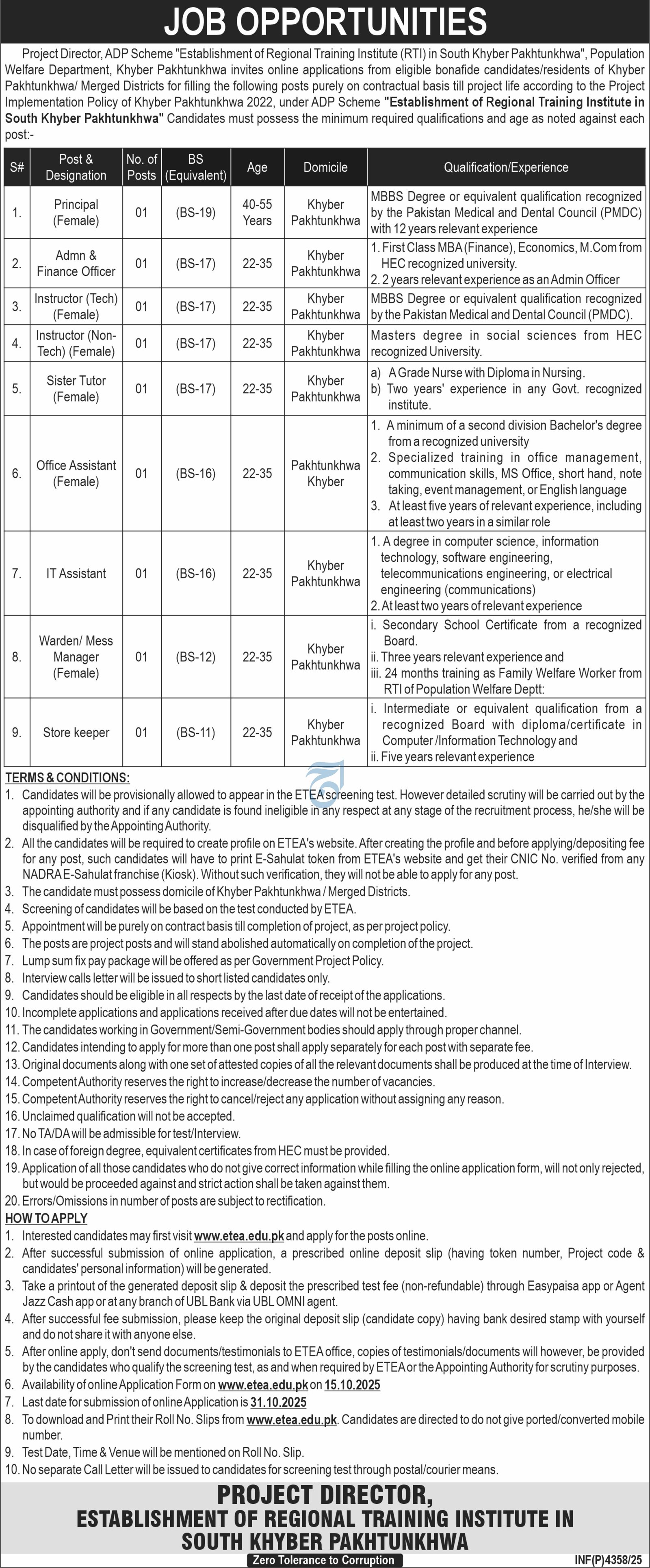 Project Director, ADP Scheme “Establishment of Regional Training Institute (RTI) in South Khyber Pakhtunkhwa” Population Welfare Department, Khyber Pakhtunkhwa invites online applications from eligible bonafide candidates/residents of Khyber Pakhtunkhwa/Merged Districts for filling the following posts purely on contractual basis till project life according to the Project Implementation Policy of Khyber Pakhtunkhwa 2022, under ADP Scheme “Establishment of Regional Training Institute in South Khyber Pakhtunkhwa”. Candidates must possess the minimum required qualifications and age as noted against each post.