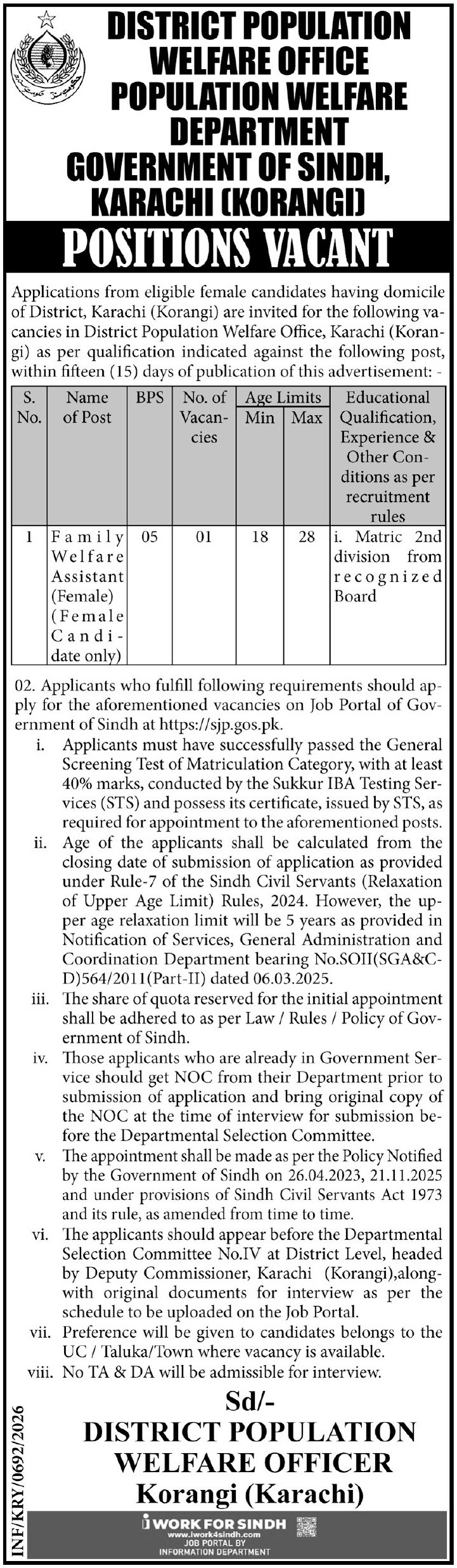 Population Welfare Department Korangi Karachi Jobs 2026 announce the Contract career opportunities for the post of See Below Ad in Sindh, Karachi for the fresh and experienced candidates on Contract basis who have Check Advertisement degree. Posted date of this post is 25/02/2026 and the last date is 11/03/2026. if you are eligible for this job apply before due date.